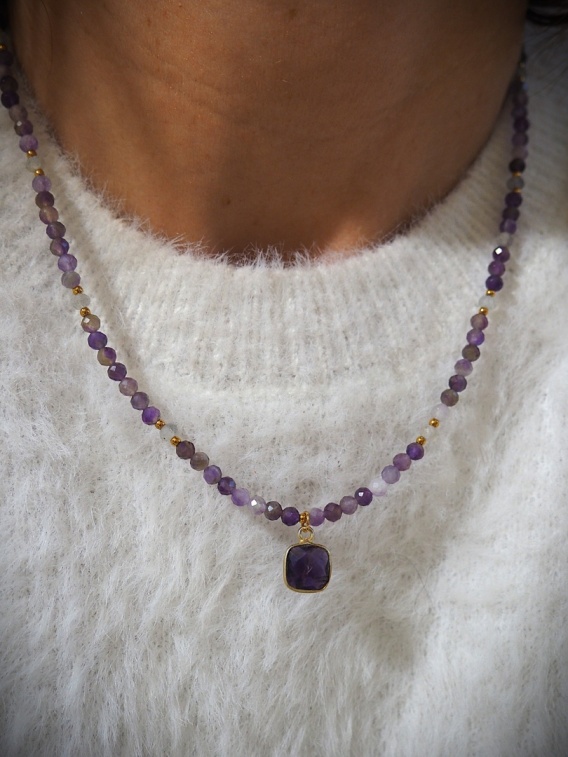 Naszyjnik łączy dwa kamienie, które wspólnie tworzą energię ochrony, jasności i głębokiej intuicji. Delikatny fiolet ametystu przenika się z tajemniczym, połyskującym blaskiem labradorytu, tworząc aurę, która działa jak tarcza i przewodnik jednocześnie.