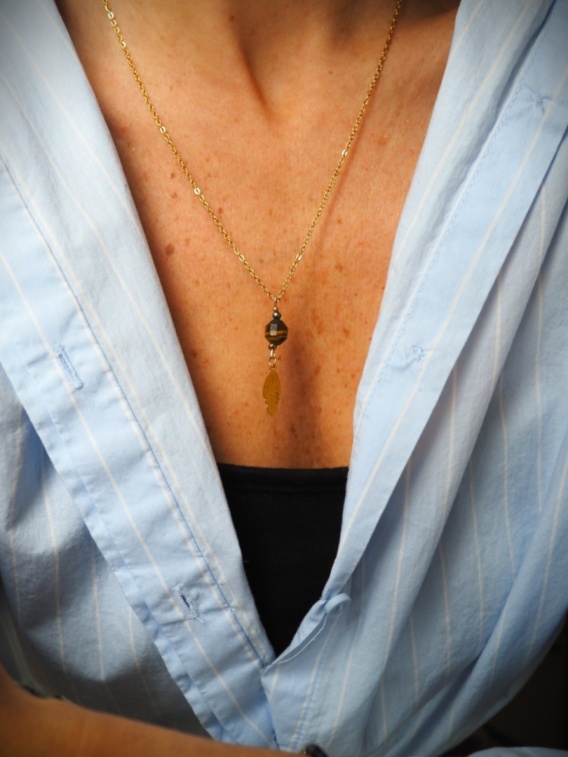 Elegancki łańcuszek o długości około 50 cm, zdobiony zawieszką z tygrysiego oka, pirytu i delikatnym piórkiem. To połączenie naturalnych kamieni i symbolicznego motywu tworzy biżuterię pełną energii, blasku i ochrony.