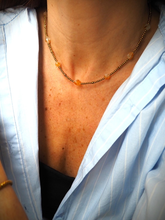 Elegancki naszyjnik wykonany z fasetowanych cytrynów o intensywnym, słonecznym kolorze, uzupełniony złotym hematytem. Subtelny połysk kamieni i złotych akcentów nadaje biżuterii elegancji i promiennego charakteru.